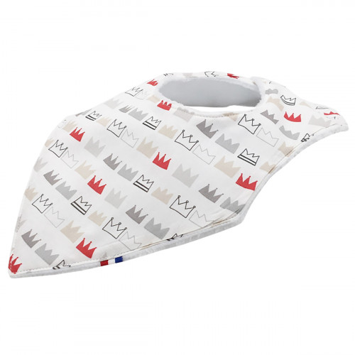 Ce bavoir est composé de deux types de tissus : une face visible en coton et une face cachée ultra douce rouge pour ne pas irriter bébé autour de son petit cou. Ce bavoir a été conçu pour bien épouser la forme des épaules de bébé.