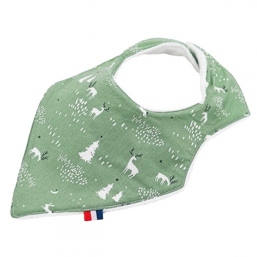Ce bavoir est composé de deux types de tissus : une face visible en coton et une face cachée ultra douce vert sapin pour ne pas irriter bébé autour de son petit cou. Ce bavoir a été conçu pour bien épouser la forme des épaules de bébé.