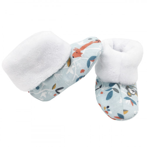 Ces chaussons hauts de naissance sont composés de deux types de tissus : un intérieur ultra doux et moelleux qui réchauffera les petits petons de bébé et un coté coton imprimé.