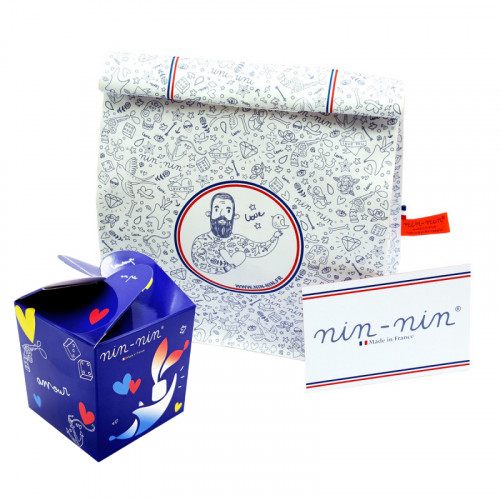 Ce coffret de naissance contient 1 Nin-Nin (doudou) livré dans un cube (boîte) tatoué, 1 Bavoir Bandana le tout livré dans 1 Lunch Bag accompagné d'1 Carte de Félicitation.