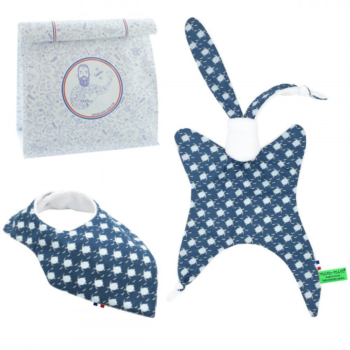 Ce coffret de naissance contient 1 Nin-Nin (doudou) livré dans un cube (boîte) tatoué, 1 Bavoir Bandana le tout livré dans 1 Lunch Bag accompagné d'1 Carte de Félicitation.