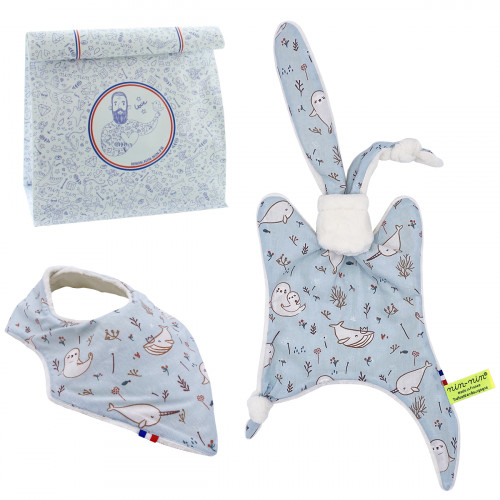 Ce coffret de naissance contient 1 Nin-Nin (doudou) livré dans un cube (boîte) tatoué, 1 Bavoir Bandana le tout livré dans 1 Lunch Bag accompagné d'1 Carte de Félicitation.