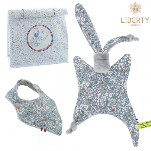 Ce coffret de naissance contient 1 Nin-Nin (doudou) livré dans un cube (boîte) tatoué, 1 Bavoir Bandana le tout livré dans 1 Lunch Bag accompagné d'1 Carte de Félicitation.