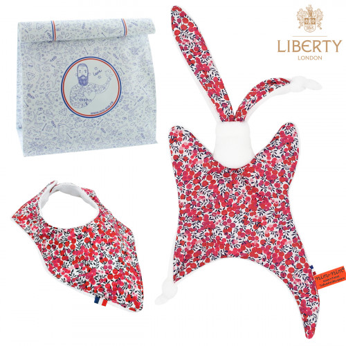 Ce coffret de naissance contient 1 Nin-Nin (doudou) livré dans un cube (boîte) tatoué, 1 Bavoir Bandana le tout livré dans 1 Lunch Bag accompagné d'1 Carte de Félicitation.