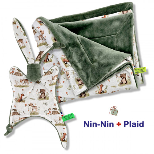 Ce coffret de naissance contient 1 Nin-Nin (doudou) livré dans un cube (boîte) tatoué, 1 Plaid accompagnés d'1 Carte de Félicitation.