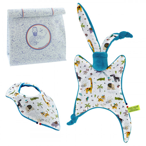 Ce coffret de naissance contient 1 Nin-Nin (doudou) livré dans un cube (boîte) tatoué, 1 Plaid accompagnés d'1 Carte de Félicitation.