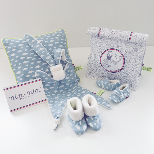 Ce coffret de naissance contient 1 Nin-Nin (doudou) livré dans un cube (boîte) tatoué, 1 Plaid accompagnés d'1 Carte de Félicitation.