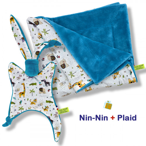 Ce coffret de naissance contient 1 Nin-Nin (doudou) livré dans un cube (boîte) tatoué, 1 Plaid accompagnés d'1 Carte de Félicitation.