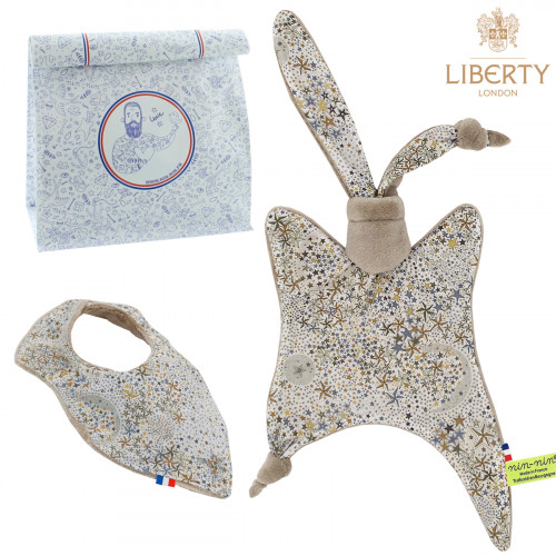 Ce coffret de naissance contient 1 Nin-Nin (doudou) livré dans un cube (boîte) tatoué, 1 Plaid accompagnés d'1 Carte de Félicitation.