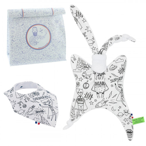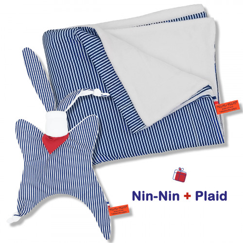 Ce coffret de naissance contient 1 Nin-Nin (doudou) livré dans un cube (boîte) tatoué, 1 Plaid accompagnés d'1 Carte de Félicitation.