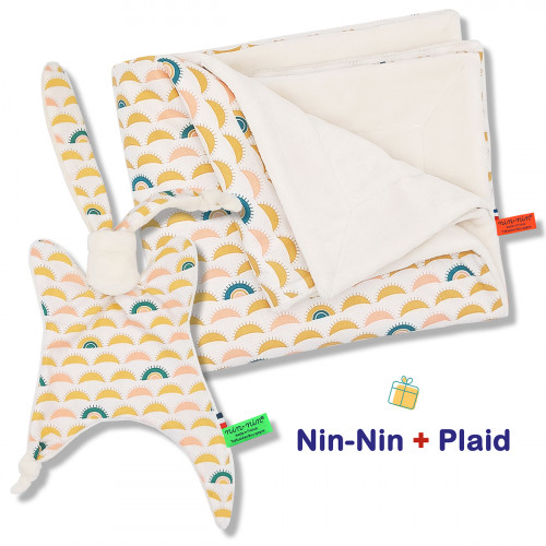 Ce coffret de naissance contient 1 Nin-Nin (doudou) livré dans un cube (boîte) tatoué, 1 Bavoir Bandana le tout livré dans 1 Lunch Bag accompagné d'1 Carte de Félicitation.