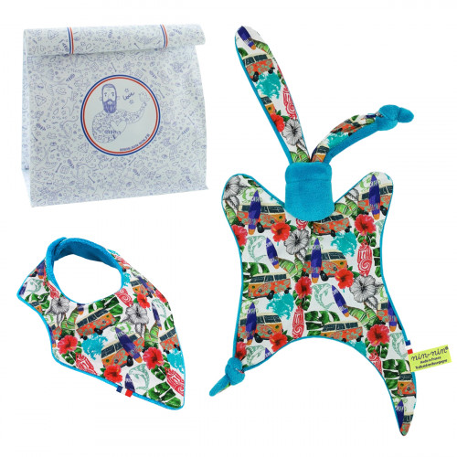 Ce coffret de naissance contient 1 Nin-Nin (doudou) livré dans un cube (boîte) tatoué, 1 Bavoir Bandana le tout livré dans 1 Lunch Bag accompagné d'1 Carte de Félicitation.