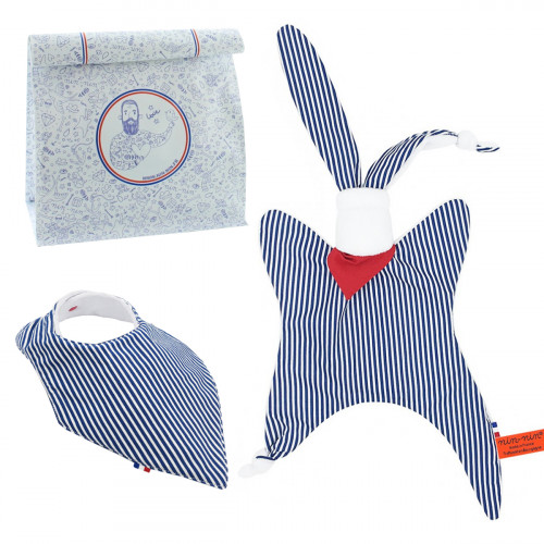 Ce coffret de naissance contient 1 Nin-Nin (doudou) livré dans un cube (boîte) tatoué, 1 Bavoir Bandana le tout livré dans 1 Lunch Bag accompagné d'1 Carte de Félicitation.