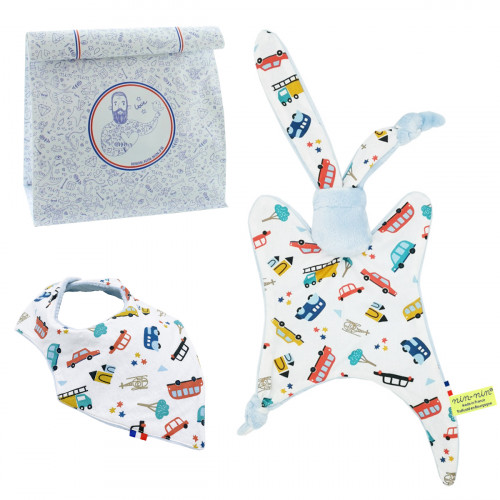 Ce coffret de naissance contient 1 Nin-Nin (doudou) livré dans un cube (boîte) tatoué, 1 Bavoir Bandana le tout livré dans 1 Lunch Bag accompagné d'1 Carte de Félicitation.