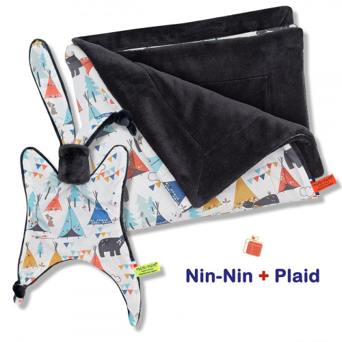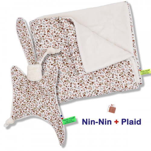 Ce coffret de naissance contient 1 Nin-Nin (doudou) livré dans un cube (boîte) tatoué, 1 Plaid accompagnés d'1 Carte de Félicitation.