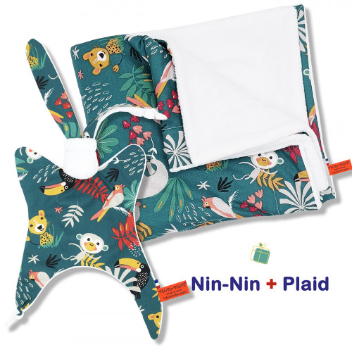 Ce coffret de naissance contient 1 Nin-Nin (doudou) livré dans un cube (boîte) tatoué, 1 Plaid accompagnés d'1 Carte de Félicitation.