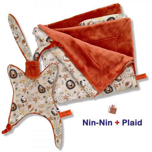 Ce coffret de naissance contient 1 Nin-Nin (doudou) livré dans un cube (boîte) tatoué, 1 Plaid accompagnés d'1 Carte de Félicitation.