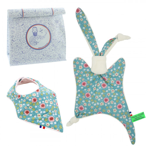 Ce coffret de naissance contient 1 Nin-Nin (doudou) livré dans un cube (boîte) tatoué, 1 Plaid accompagnés d'1 Carte de Félicitation.