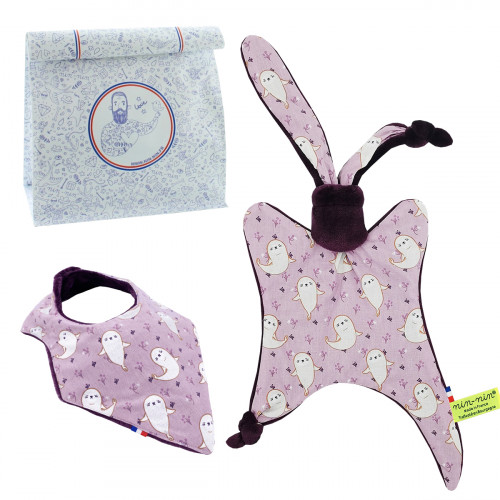 Ce coffret de naissance contient 1 Nin-Nin (doudou) livré dans un cube (boîte) tatoué, 1 Bavoir Bandana le tout livré dans 1 Lunch Bag accompagné d'1 Carte de Félicitation.