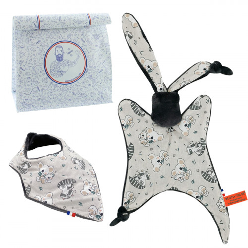 Ce coffret de naissance contient 1 Nin-Nin (doudou) livré dans un cube (boîte) tatoué, 1 Bavoir Bandana le tout livré dans 1 Lunch Bag accompagné d'1 Carte de Félicitation.