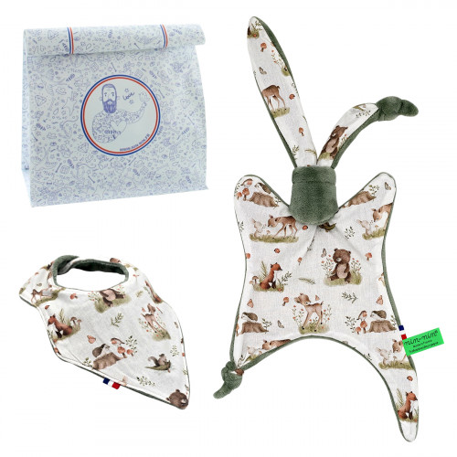 Ce coffret de naissance contient 1 Nin-Nin (doudou) livré dans un cube (boîte) tatoué, 1 Bavoir Bandana le tout livré dans 1 Lunch Bag accompagné d'1 Carte de Félicitation.