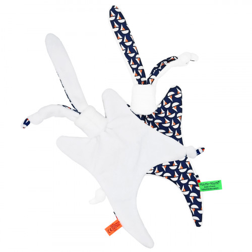 Ce doudou est composé de deux types de tissus : un côté ultra doux qui rassure et apaise et un coté coton imprimé. Ses extrémités très fines sont extrêmement faciles à prendre en main et à manipuler pour les toutes petites mains des nouveau-nés.
