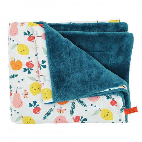 Ce plaid est composé de deux types de tissus : un côté doudou qui rassure et apaise et un coté coton imprimé.