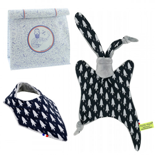 Coffret de naissance doudou et bavoir Jack. Original et fabriqué en France. Marque Nin-Nin