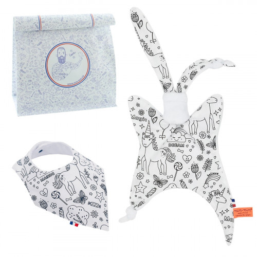 Ce coffret de naissance contient 1 Nin-Nin (doudou) livré dans un cube (boîte) tatoué, 1 Bavoir Bandana le tout livré dans 1 Lunch Bag accompagné d'1 Carte de Félicitation.